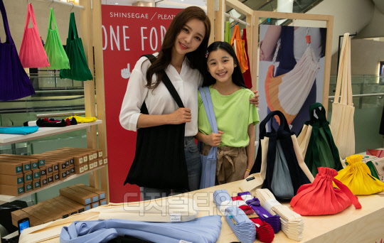 신세계백화점 모델이 18일 서울 중구 본점 플리츠마마 팝업스토어에서 친환경 가방을 선보이고 있다. 이는 버려진 페트병 16개를 재활용해 만들어졌으며, 고객이 가방 한 개를 구매하면 신세계가 취약 청소년 계층에 한 개를 전달하는 방식의 기부로 진행된다.
