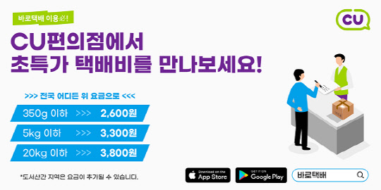 체인로지스 측은 바로택배 앱을 통해 택배를 신청하고 가까운 CU편의점에서 접수시킬 경우 ▽350g 이하 2,600원 ▽5kg 이하 3,300원 ▽20kg 이하 3,800원 등 3단계 요금제가 적용된다고 24일 밝혔다.