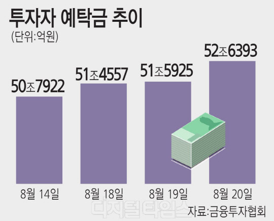 24일 금융투자협회에 따르면 증권사 투자자예탁금은 지난 20일 현재 52조6393억원으로 역대 최대치를 기록했다. 투자자 예탁금은 주식매수를 위해 증권 계좌에 입금된 대기자금이다.