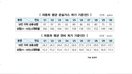 고시에 따르면 총 중량 3.5톤 미만의 중·소형 자동차 가운데 10인승 이하의 승용차·승합차는 현재 1㎞ 당 97g의 온실가스 배출 기준 또는 리터당 24.3㎞의 연비 기준을 오는 2030년까지 1㎞ 당 70g 온실가스 또는 리터당 33.1㎞ 연비 기준을 충족해야 한다. 또 11∼15인승 승합차와 소형화물차는 현재 1㎞ 당 166g의 온실가스 배출 기준 또는 리터당 15.2㎞의 연비 기준을 2030년까지 1㎞ 당 146g의 온실가스 배출 기준 또는 리터당 17.3㎞의 연비 기준을 맞춰야 한다.