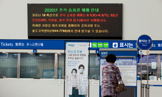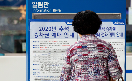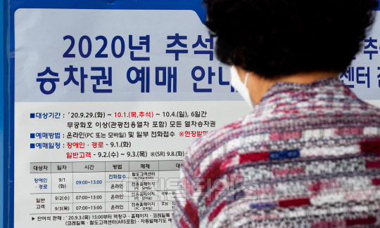 추석 열차표 예매가 시작된 1일 서울 용산구 서울역 매표소에서 한 시민이 안내문을 보고 있다. 코로나19 확산을 막기 위해 이번 추석 명절 열차표는 1일(노인, 장애인) 8~9일(일반)에 코레일 철도고객센터 전화와 홈페이지, 앱에서 모두 비대면으로 판매한다.