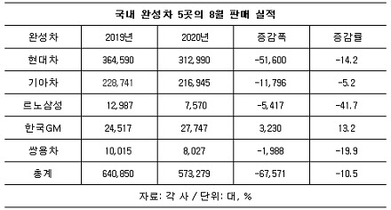 [디지털타임스 장우진 기자] 국내 완성차 5곳의 지난달 판매 실적이 전년보다 10% 이상 감소한 것으로 나타났다. 해외 판매는 코로나19에 5개월 연속 감소세를 이어갔고 완성차들의 실적을 지탱해 주던 국내 판매도 개별소비세 인하폭 축소 여파로 전년보다 나빠졌다.