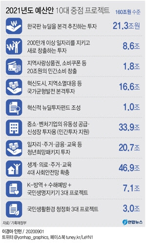 ◆한국판 뉴딜에 21.3조 투입= 정부가 내년 예산안에서 가장 중점을 둔 것은 한국판 뉴딜 사업이다. 내년 국비 21조3000억원을 투입한다. 지방비, 민간자본을 합친 총 투자 규모는 32조5000억원이다. 특히 데이터 댐, 그린스마트 스쿨, 그린리모델링 등 10대 대표 과제와 고용·사회안전망 강화에 국비의 80%인 17조원을 쏟아붓는다.