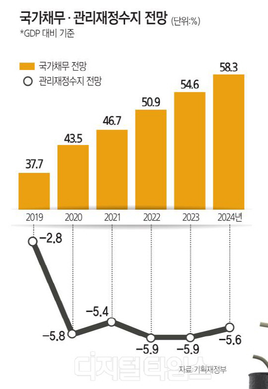 이에 따라 올해 43.5%까지 치솟아 있는 국내총생산(GDP) 대비 국가채무 비율도 내년 46.7%로 45%선을 돌파한 이래 2022년 50.9%를 기록, 2024년에는 58.3%까지 급증한다. 그동안 재정 건전성 유지의 마지노선으로 여겨졌던 '채무 비율 40%'는 이미 올해 코로나19 대응을 위한 1차 추경(41.2%)으로 무너진 상태다.