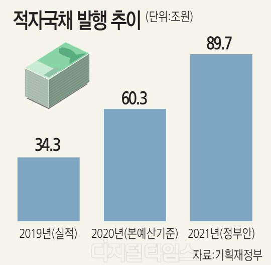 1일 국무회의에서 확정된 '2021년 예산안'에 따르면 정부는 내년 172조9000억원의 국채를 발행할 계획이다. 지난해 발행 실적(101조7000억원)보다 71조2000억원 늘어난 수치다. 이 중에서 적자국채는 지난해(34조3000억원)보다 무려 3배 가까이 증가한 89조7000억원을 발행하기로 했다. 사실상 역대 최대다.