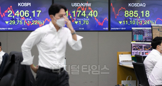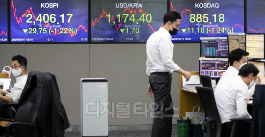 코스피와 코스닥이 전 거래일보다 1%대 하락한 17일 서울 중구 하나은행 딜링룸에서 직원들이 분주히 업무를 보고 있다. 이날 코스피는 전일 대비 29.75포인트 하락한 2406.17로, 코스닥은 전일 대비 11.10포인트 하락한 885.18, 원·달러 환율은 전일 대비 1.7원 내린 1174.4원으로 장 마감했다.