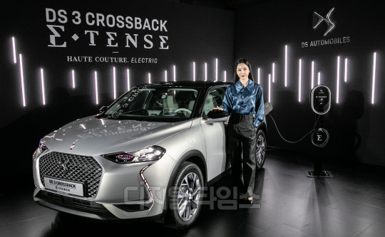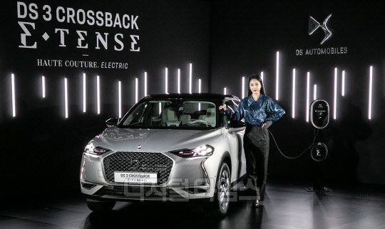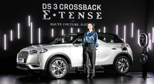DS오토모빌은 21일 브랜드 최초 순수 전기차 'DS3 크로스백 E-텐스'를 공식 출시했다. 이날 서울 강남구 DS스토어에서 모델이 'DS3 크로스백 E-텐스' 차량과 함께 포즈를 취하고 있다.