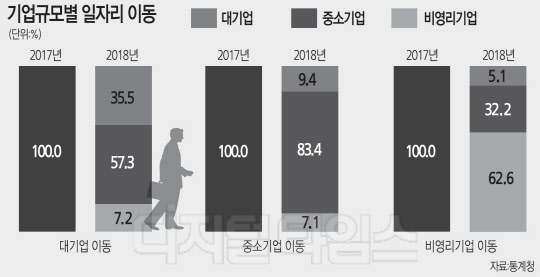 2017년에서 2018년 사이 일자리를 이동한 근로자의 75.2%는 동일한 기업규모로 이동했다. 2017년 중소기업에서 일하다가 2018년 이직한 근로자 299만2000명 가운데 대기업으로 옮긴 근로자는 9.4%인 28만2000명이었다. 반면 대기업에서 이직한 46만명 가운데 중소기업으로 옮긴 근로자는 57.3%인 26만4000명이었다.