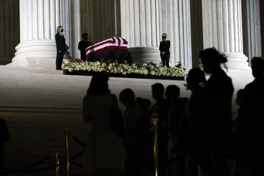 23일(현지시간) 고(故) 루스 베이더 긴즈버그 미국 연방대법관의 시신이 안치돼 있는 연방대법원 앞에 일반인 조문객들이 숙연한 모습으로 조문하고 있다. 25일엔 의회로 옮겨져 추모 행사가 엄수될 예정이다.
