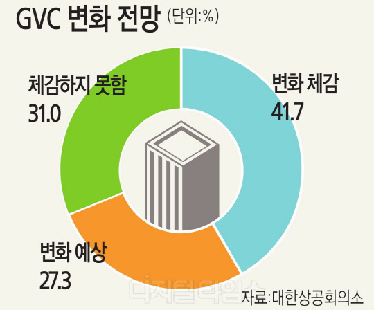대한상공회의소는 최근 국내 제조업체 300개사를 대상으로 '글로벌 가치사슬(GVC) 재편 전망과 대응실태'를 조사한 결과, 기업 41.7%가 'GVC 변화를 체감'하고 있고, 27.3%는 '변화를 예상'하고 있다고 답했다고 27일 밝혔다. 체감하지 못한다는 답변은 31.0%에 불과했다.