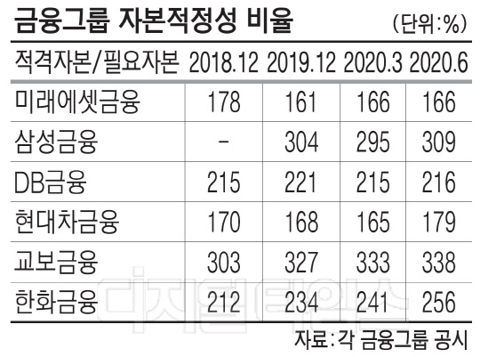6일 금융그룹 공시에 따르면 미래에셋금융그룹의 자본적정성 비율은 2019년 말 기준 161%로 6개 금융그룹 가운데 가장 낮은 수준이다. 현대차금융그룹의 자본적정성 비율도 168%로 미래에셋금융그룹과 비슷한 수준이다.