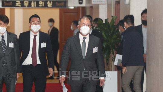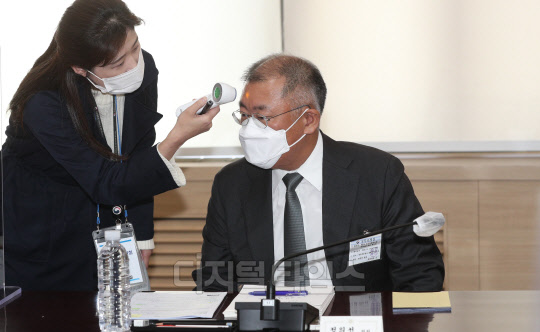 [포토] 회의 앞서 체온 재는 정의선 현대자동차 회장