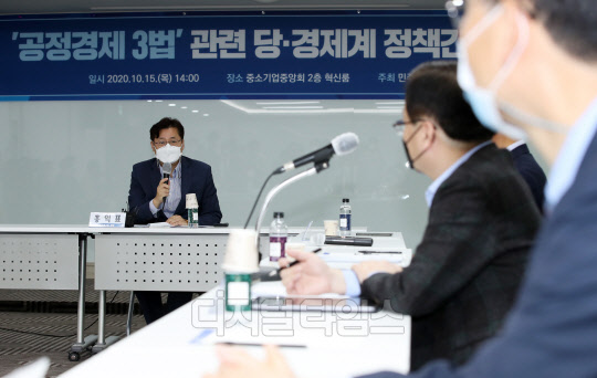 더불어민주당 싱크탱크 민주연구원의 원장을 맡고 있는 홍익표 의원이 15일 서울 여의도 중소기업중앙회에서 열린 공정경제 3법(상법·공정거래법 개정안, 금융그룹 감독법 제정안) 관련 당·경제계 정책간담회에서 인사말을 하고 있다.