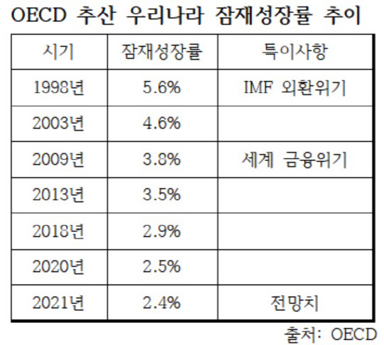 이처럼 인구 구조가 노화함에 따라 잠재성장률 역시 낮아지고 있다. 올해 초 경제협력개발기구(OECD)는 종전 2.7%였던 우리나라의 잠재성장률을 2.5%로 추산했다. 외환위기를 겪은 1998년에도 5%대로 비교적 높았던 잠재성장률이 불과 20년 남짓한 사이에 절반 수준으로 떨어진 것이다.