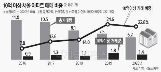 2016년 8583건이던 10억원 이상 서울 아파트 거래량은 문재인 정부 출범 시기인 2017년 1만3206건으로 1년 만에 54%(4623건)나 급증했고, 2019년에는 1만8419건으로 3년 새 9836건(115%) 이상 불어났다. 올해도 현재까지 1만4142건이 거래됐다. 거래 비중으로 따지면 2016년 7.8%, 2017년 12.6%, 2018년 14%, 2019년 24.6% 등으로 매년 가파르게 증가했으며 올해도 현재 22.8%를 기록 중이다.