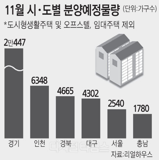 아파트 분양평가업체 리얼하우스는 11월 전국에서 총 5만6246가구가 분양될 예정으로 조사됐다고 29일 밝혔다. 이 중 일반분양 물량은 4만8420가구다. 이는 지난달(1만1147가구)보다 무려 4.3배나 늘어난 물량이다. 지난해 같은기간(2만1495가구)와 비교해도 2.3배나 물량이 더 많다.