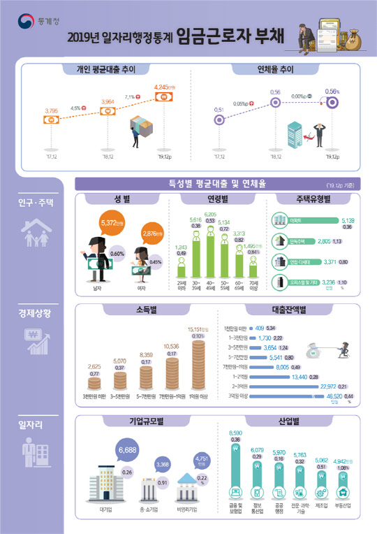 29일 통계청이 발간한 '2019년 일자리행정통계 임금근로자 부채'에 따르면 지난해 말 임금근로자의 평균대출은 4245만원, 중위대출은 4000만원으로 집계됐다. 전년과 비교하면 각각 281만원(7.1%), 440만원(12.4%)씩 증가한 수치다. 연령대별 평균대출은 40대가 6205만원으로 가장 많고, 뒤이어 30대(5616만원), 50대(5134만원), 60대(3313만원), 70세 이상(1495만원), 29세 이하(1243만원) 순이었다.