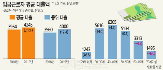 29일 통계청이 발간한 '2019년 일자리행정통계 임금근로자 부채'에 따르면 지난해 말 기준 임금근로자의 평균대출은 4245만원, 중위대출은 4000만원으로 집계됐다. 전년과 비교하면 각각 281만원(7.1%), 440만원(12.4%)씩 증가한 수치다. 연령대별 평균대출은 40대가 6205만원으로 가장 많고, 뒤이어 30대(5616만원), 50대(5134만원), 60대(3313만원), 70세 이상(1495만원), 29세 이하(1243만원) 순이었다. 29세 이하에서는 주택 외 담보대출이 85.8%(248만원) 폭증했다. 주택담보대출도 27.4%(57만원) 늘었다. 30대의 경우도 주택 외 담보대출과 주택담보대출이 각각 20.4%(313만원), 18%(206만원) 증가했다.