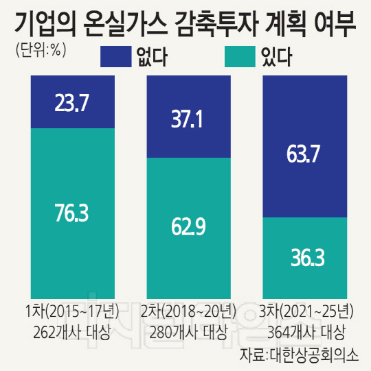 계획기간 중 온실가스 감축투자 계획이 있다고 응답한 비율은 1차 계획기간(2015~2017년) 76.3%에서 2차 계획기간(2018~2020년) 62.9%로 줄었고, 3차 기간(2021∼2025)은 36.3%로 가장 적었다. 시범·운영 단계를 거쳐 본격적으로 시행됐음에도 오히려 기업들의 투자가 줄고 있는 것이다.