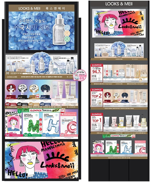 오프라인에 입점하는 룩스앤메이 제품은 지난 5월부터 지금까지 글로우픽 2,800여개 시트 마스크팩 중 전체 1위를 유지하며 입소문을 타고 있는 '센텔라 릴렉세이션 퍼펙트 카밍 마스크'를 포함하여, 글로우픽 월간 베스트픽에 선정된 '유브이 모이스트 피치 톤업 선크림', '아미노 버블 약산성 클렌저', '아우라 워터 글로우 쿠션' 등 글로우픽 TOP3내 순위에 포진한 다양한 제품들과 스킨케어, 색조, 마스크팩 등 총 24종에 이른다. 그리고 수염기른 모델 신유은의 귀엽고 엉뚱한 매력으로 유튜브에서 화제가 되고있는 광고의 주인공 '하이드레인저 시카 세럼'(이하 수카세럼) 또한 만나볼 수 있다.