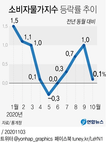 3일 통계청이 발표한 '10월 소비자물가 동향'에 따르면 10월 소비자물가지수는 105.61(2015년=100)로 전년 동월 대비 0.1% 상승하는 데 그쳤다. 지난 6월 이후 4개월 만에 최저치다.