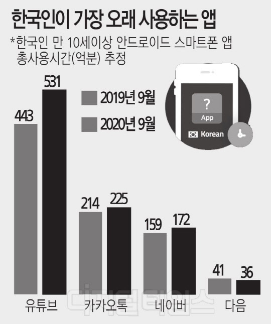 국내 유튜브 이용시간이 네이버, 카카오의 2배를 뛰어넘는 것으로 집계됐다. 유튜브 쏠림이 심화되면서, '정보주권'이 글로벌 IT기업으로 넘어가고 있다는 우려도 커지고 있다.