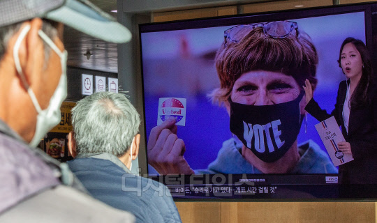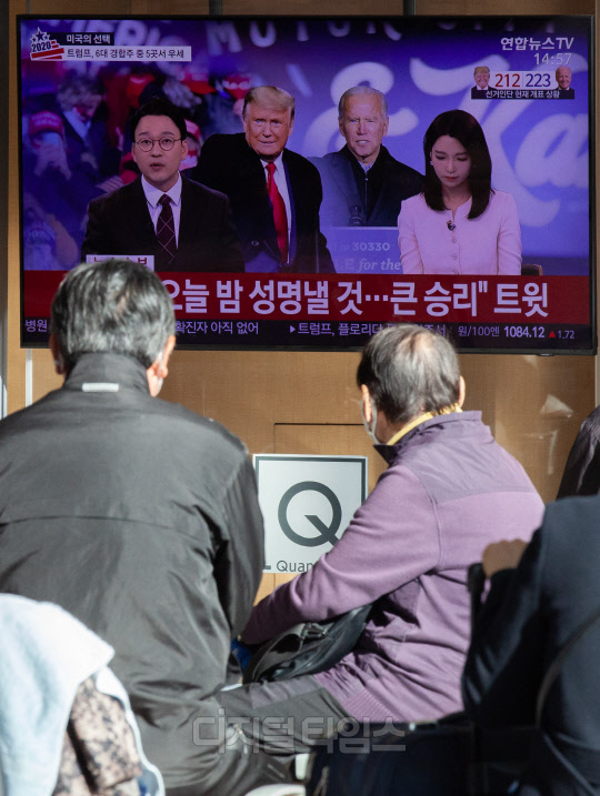 4일 서울역에서 시민들이 미국 대통령 선거 관련 방송을 시청하고 있다.