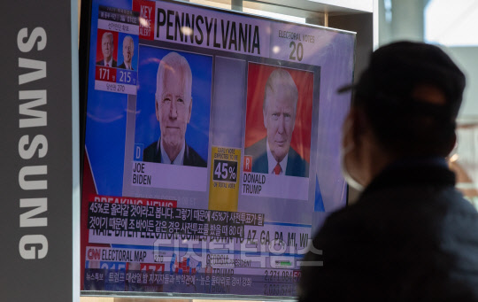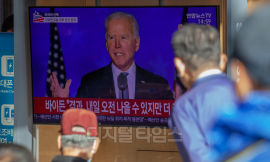 4일 서울역에서 시민들이 미국 대통령 선거 관련 방송을 시청하고 있다.