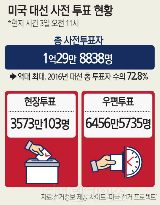 선거정보 제공 사이트 '미국 선거 프로젝트'에 따르면 3일 오전 11시 현재 총 사전투표자 수는 1억29만8838명으로 집계됐다.