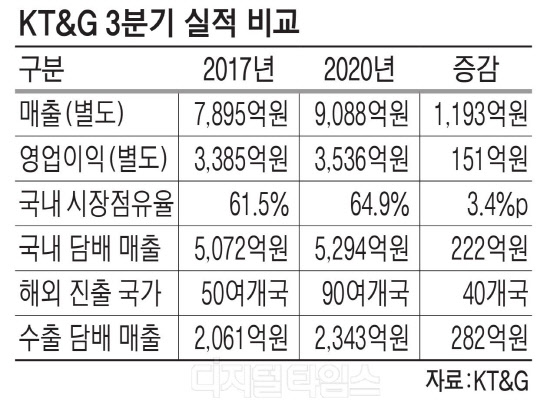 KT&G 관계자는 "2017년 '글로벌 톱4' 비전 선포 이후 딱 3년이 지났고, 2017년 3분기 실적과 올해 3분기 실적을 비교했을 때 모든 실적 지표가 고르게 상승했다"면서 "비재무적 가치인 MSCI ESG(Environment·Social·Governance) 평가 등급도 2017년 BB등급에서 2019년 A등급으로 상승했다"고 말했다.