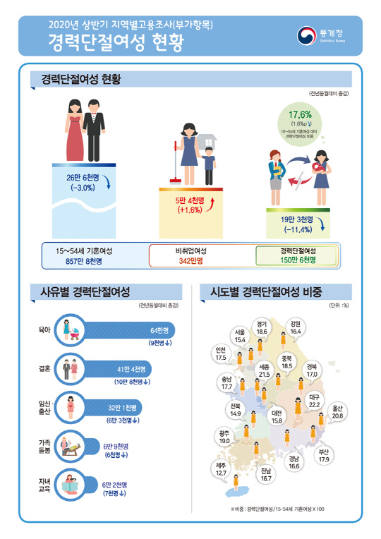 24일 통계청이 발표한 '2020년 상반기 지역별고용조사 경력단절 여성 현황'에 따르면 올해 4월 기준 15~54세 기혼여성은 857만8000명으로 집계됐다. 이 가운데 경력단절 여성은 150만6000명으로 지난해보다 19만3000명(11.4%) 줄었다. 또 기혼여성 대비 경력단절 여성 비중도 17.6%로 1.6%포인트(p) 감소했다.