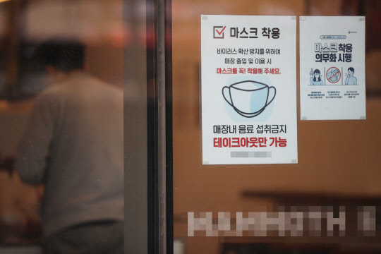 수도권 사회적 거리 두기가 2단계로 격상된 24일 서울의 한 카페 앞에 "테이크 아웃만 가능"이라고 적힌 안내문이 붙어 있다.