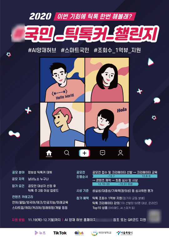 국민대학교(총장 임홍재)가 AI 양재 허브 · Z세대 타깃 미디어 뉴즈 · 글로벌 숏폼 영상 플랫폼 틱톡과 함께 오는 12월 10일(목) 「2020 국민 틱톡커 챌린지」를 진행한다. 「2020 국민 틱톡커 챌린지」는 누구나 스마트 국민이 될 수 있다는 슬로건을 바탕으로 정보성 크리에이터들을 발굴하고 질 좋은 정보들을 더 많은 사람들에게 알리기 위해 마련된 공모전이다. 국내 대학교와 유관기관이 뉴미디어와 손잡고 틱톡 공모전을 여는 최초 사례이기에 더욱 주목을 끈다.