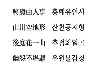 금릉을 찾은 유우석(劉禹錫)이 그 옛날 왕조의 영화를 생각하며 쓴 시의 후반구다. 작자는 나라의 흥망은 인사(人事)에 달려있다고 말한다. 금릉은 난징(南京)의 옛 이름이다. 후정화(後庭花)는 육조(六朝)의 마지막 군주 진(陳) 후주(後主)가 지었다는 노래로 망국의 노래로 간주되고 있다.
