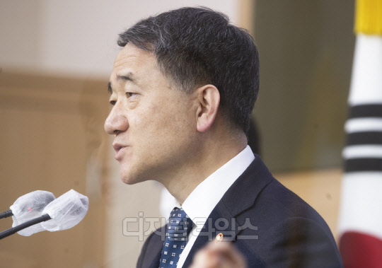 박능후 보건복지부 장관이 8일 종로구 정부서울청사 별관에서 코로나19 백신 도입 계획 브리핑을 하고 있다.