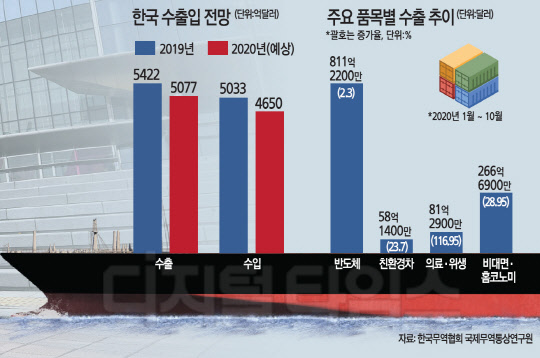 [디지털타임스 김위수 기자] 코로나19사태라는 미증유의 위기에도 반도체·자동차·친환경차 등 첨단제품의 수출증가로 우리나라 수출이 기적같은 회복세를 보였다. 첨단 미래기술분야에 대거 투자해온 대기업의 경쟁력이 2020년 한국 수출에 빛나는 성과를 안겨줬다는 평가가 나온다.