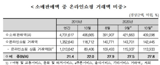 코로나19 탓에 오프라인을 중심으로 한 자영업자들이 힘겨워하는 사이 온라인 소비는 폭증하는 모양새다. 전체 소매판매에서 온라인쇼핑 비중이 높아지는 것은 일반적인 모습이지만, 코로나19가 이러한 추세에 기름을 부었다는 분석이다. 온라인쇼핑 거래액은 최근 석 달째 14조원대를 기록하고 있는 중이다.