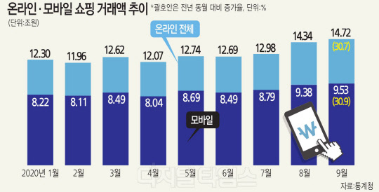 코로나19 탓에 오프라인을 중심으로 한 자영업자들이 힘겨워하는 사이 온라인 소비는 폭증하는 모양새다. 전체 소매판매에서 온라인쇼핑 비중이 높아지는 것은 일반적인 모습이지만, 코로나19가 이러한 추세에 기름을 부었다는 분석이다. 온라인쇼핑 거래액은 최근 석 달째 14조원대를 기록하고 있는 중이다.