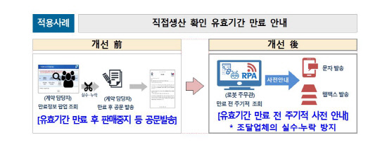 특히 직접생산 유효기간 만료 관리 업무의 경우, 기존에는 담당자가 유효기간이 만료된 조달업체 정보를 직접 확인한 후, 공문서를 작성해 송부했다. RPA 도입 이후 로봇이 직접생산 유효기간 만료 이전에 정보 조회 이후 자동 안내함으로써, 조달업체는 유효기간 만료 이전에 직접생산 증명서를 기간을 갱신할 수 있게 됐다.