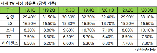 한국 TV의 위상도 한층 더 높아졌다. 옴디아에 따르면 작년 1분기 금액 기준으로 45.9%였던 삼성·LG전자의 TV시장 점유율은 올 3분기 49.7%로 상승했다.