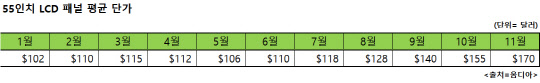 시장조사업체 옴디아에 따르면 올 초 102달러였던 55인치 LCD 패널 평균 가격은 11월 20일 기준으로 170달러를 기록, 11개월 만에 67%나 상승했다. LG디스플레이는 이 같은 패널 가격 상승의 영향으로 7분기 만에 흑자 전환에 성공했고, 여기에 중국 광저우 OLED(유기발광다이오드) 패널 생산공장까지 본격 가동하면서 내년에는 본격적인 턴어라운드가 기대된다.