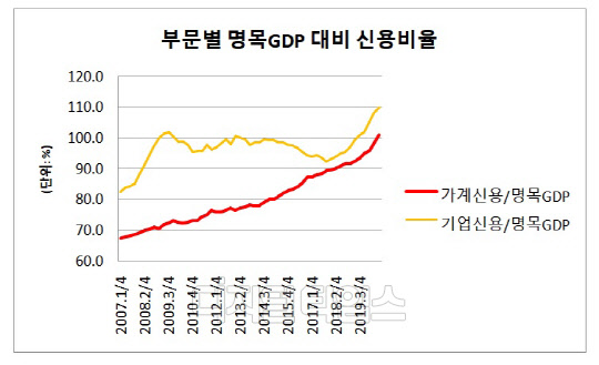 부문별로 가계신용/명목GDP 비율은 3분기에 101.1%로 전년 동기 대비 7.4%포인트 높아졌다. 가계신용/명목GDP 비율이 100%를 넘어선 것은 2000년 관련 통계 편제 이후 처음이다. 기업신용/명목GDP 비율은 110.1%로 역시 1년 전보다 9.2%포인트 상승했다.