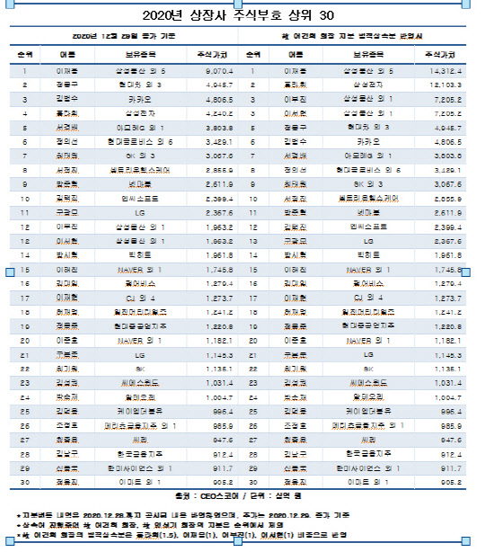 30일 기업평가사이트 CEO스코어가 29일 기준 국내 상장사 주식을 보유한 개인 2만2213명의 종가 기준 지분가치를 조사한 결과 9조704원의 보유지분을 기록한 이재용 부회장이 주식부호 1위를 차지했다. 이 부회장은 고(故)이건희 삼성전자 삼성전자 회장이 순위에서 빠지면서 지난해 2위에서 한 계단 올라섰다. 이 부회장의 보유지분가치는 지난해 연말 7조3518억원에서 2조원 가까이 늘어나 9조704억원이다. 2위는 4조9457억원을 기록한 정몽구 현대자동차그룹 명예회장이 차지했다. 정 명예회장은 작년 말 대비 보유지분가치가 1조원 가까이 증가했다.