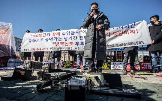 한국코인노래연습장협회, 소상공인연합회, 전국상인연합회 등 관계자들이 6일 서울 여의도 국회 앞에서 장기간 미사용으로 습기가 차거나 업데이트가 안된 노래방 기기를 파기하는 퍼포먼스 후 160일 간의 강제집합금지에 따른 긴급 기자회견을 하고 있다.