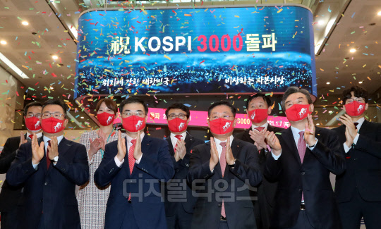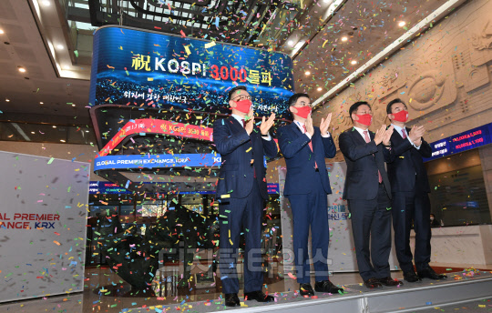 코스피가 종가 기준으로 처음 3000선을 넘겨 3031.68로 장 마감한 7일 서울 여의도 한국거래소에서 정일문 한국투자증권 대표이사(앞줄 왼쪽부터), 손병두 한국거래소 이사장, 나재철 금융투자협회장, 박현철 부국증권 대표이사 등 참석자들이 자축하고 있다.