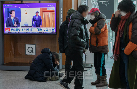 한 시민이 11일 서울역 대합실에서 문재인 대통령의 2021년 신년사를 시청 후 눈물을 훔치고 있다.