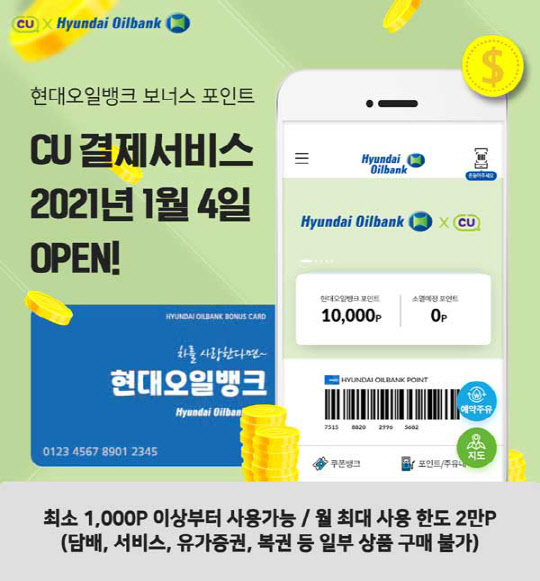 현대오일뱅크는 편의점 CU와 제휴를 맺고 전국 약 1만5000개 CU 편의점 매장에서 보너스포인트로 결제할 수 있는 서비스를 시작했다고 11일 밝혔다. 하루 한 번, 1000포인트부터 사용할 수 있으며 월 사용 한도는 2만포인트다. 다른 할인, 적립 서비스와 중복 적용은 불가능하다.