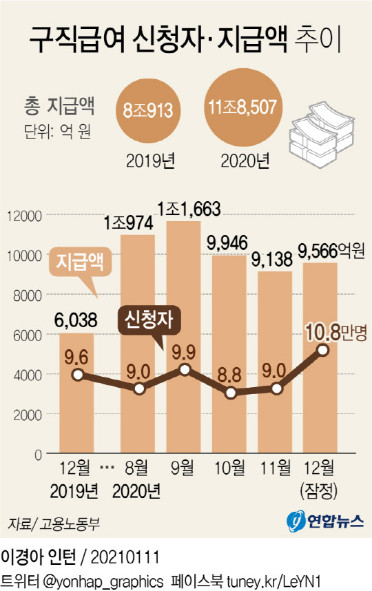 11일 고용노동부가 발표한 '고용행정 통계로 본 12월 노동시장 동향'에 따르면 지난달 구직급여 지급액은 9566억원으로 집계됐다. 이로써 지난해 1~12월 구직급여 지급액을 합한 금액은 11조8507억원이 된다. 그동안 역대 최대 기록이었던 2019년 지급액(8조913억원)을 3조원 이상 뛰어넘은 액수다. 구직급여는 정부가 실업자의 구직을 돕기 위해 고용보험기금에서 지급하는 수당으로, 통상 실업급여로 불린다.