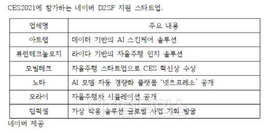 네이버가 운영하는 기업형 액셀러레이터 네이버 D2SF는 스타트업 6개 팀이 오는 11일부터 14일까지 온라인으로 열리는 CES2021에 참가한다고 11일 밝혔다. CES 2021에 참가하는 네이버 D2SF 스타트업은 아트랩을 비롯해 뷰런테크놀로지, 모빌테크, 모라이, 노타, 딥픽셀 등이다.