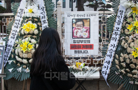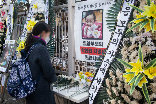 정인 양을 입양한 후 수개월간 학대해 사망에 이르게 한 혐의를 받는 양부모에 대한 첫 공판을 하루 앞둔 12일 서울 남부지검 앞에서 한 시민이 헌화하고 있다.